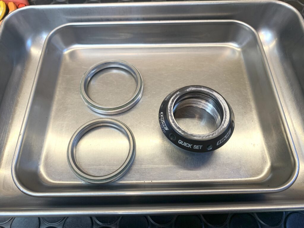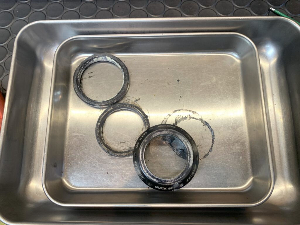 ヘッドパーツについているグリスもとても汚れています。上の写真の状態でも走れないわけではありません。でも、ベアリングの固着などを防ぐには、グリスの状態がとても大切です。