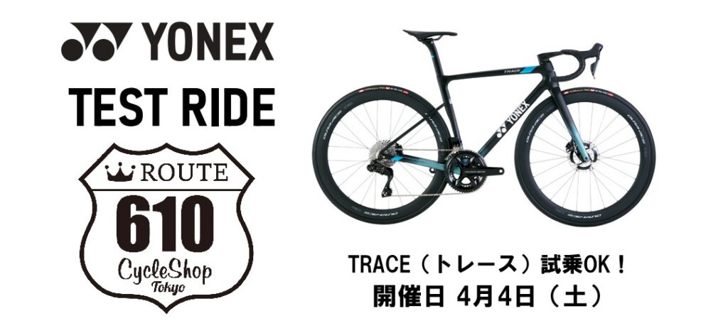 当店お勧めのロードバイクブランド「ヨネックス」の試乗会を今年も開催する事となりました!今年の目玉は何と言っても、ついに発表された!新型エアロロードフレーム「TRACE(トレース)」!もちろん今回2サイズをご用意させて頂きました!おそらく関東エリアで小規模なトレースの試乗会は当店が初になると思います!!受注生産になり、もともと数の少ないフレームなので、見るのも乗るのも、かなり貴重かと思います!ぜひこの機会をお見逃しなく!!