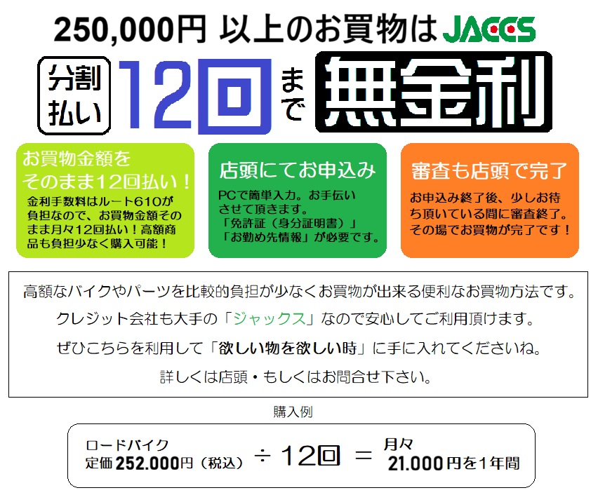 「頭金入金にも対応致します」購入例として、定価452.000円のロードバイクご購入に対して、【頭金200.000円(現金) 残金を無金利12回分割ご利用 252.000円÷12回=月々21.000円(1年間)】と言う形のご利用も可能です。詳しくはお問い合わせ下さい。(「頭金カードお支払い」にはご対応出来ない事をご了承下さい)
